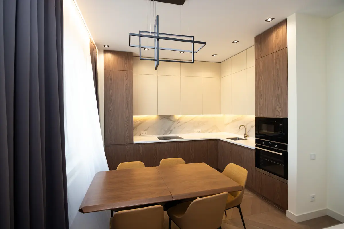 Кухня с витриной, предсказуемый рисунок, рискованная встройка, 60 миниатюр