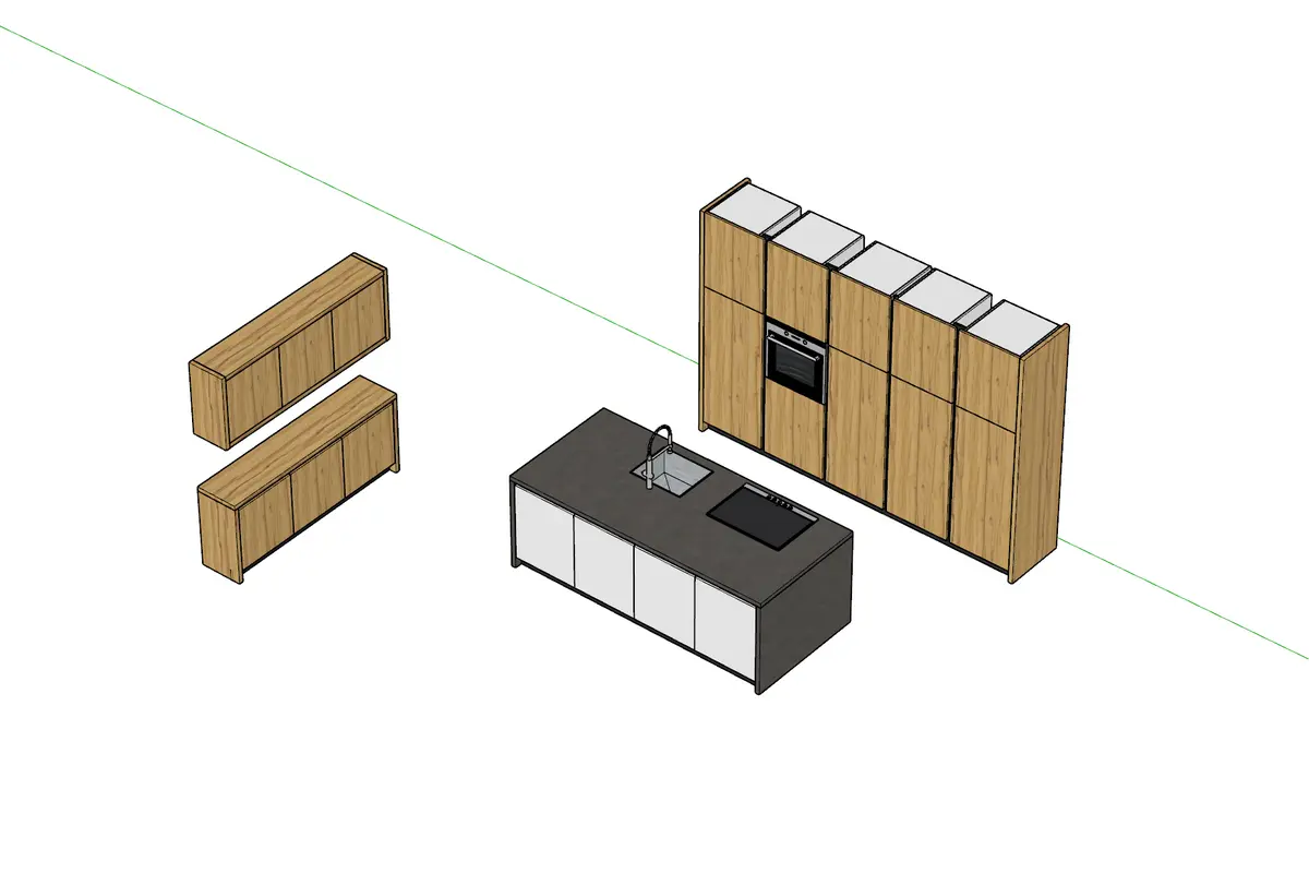 Я покажу в SketchUp назначение текстуры и цвета деталям современного кухонного гарнитура. Вернуться к плану моделирования современной кухни, скачать модель современной кухни с островом.